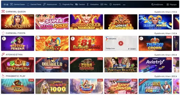 Φιλοξενούμε περίπου 10.000 παιχνίδια, με φίλτρα που σας βοηθούν να ταξινομείτε ανά κατηγορία, πάροχο και χαρακτηριστικά. Η λίστα στούντιο μας περιλαμβάνει Pragmatic Play, Play’n GO, Relax Gaming, Ezugi, Habanero, Playson, Greentube, Thunderkick, Booming Games και BGaming. Θα βρείτε Φρουτάκια, Επιτραπέζια Παιχνίδια, Live Casino, Instant Crash Games, Video Poker, Ξυστά, Bingo, καθώς και βασικούς τίτλους τραπεζιών όπως μπακαρά, ρουλέτα και μπλάκτζακ.